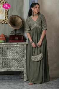 Transform your festive attire with this stunning Anarkali suit. Its intricate silver embroidery and shimmering sequins add a sparkle to any gathering, making you the center of attention.