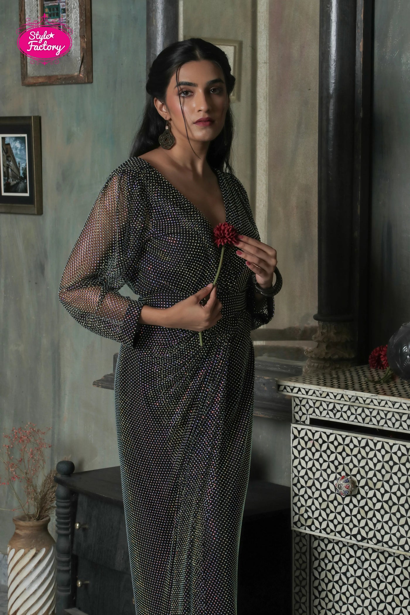 With its shimmering glitter fabric, this gown turns any gathering into a special occasion. Imagine Priya walking into her friend's wedding, feeling like a star as heads turn her way.