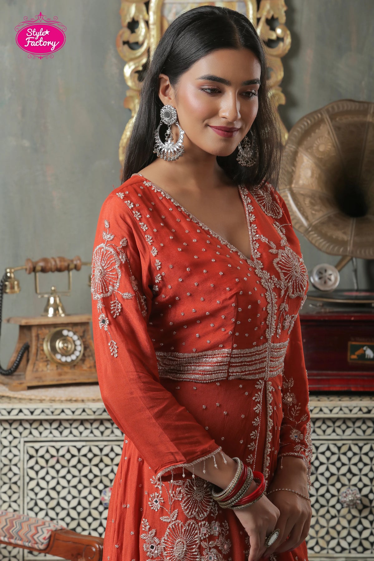 Elevate your style with this stunning center slit Indo-Western gown, paired with a dupatta. The gown features fully handworked details on the neck and body, adding to its elegance.