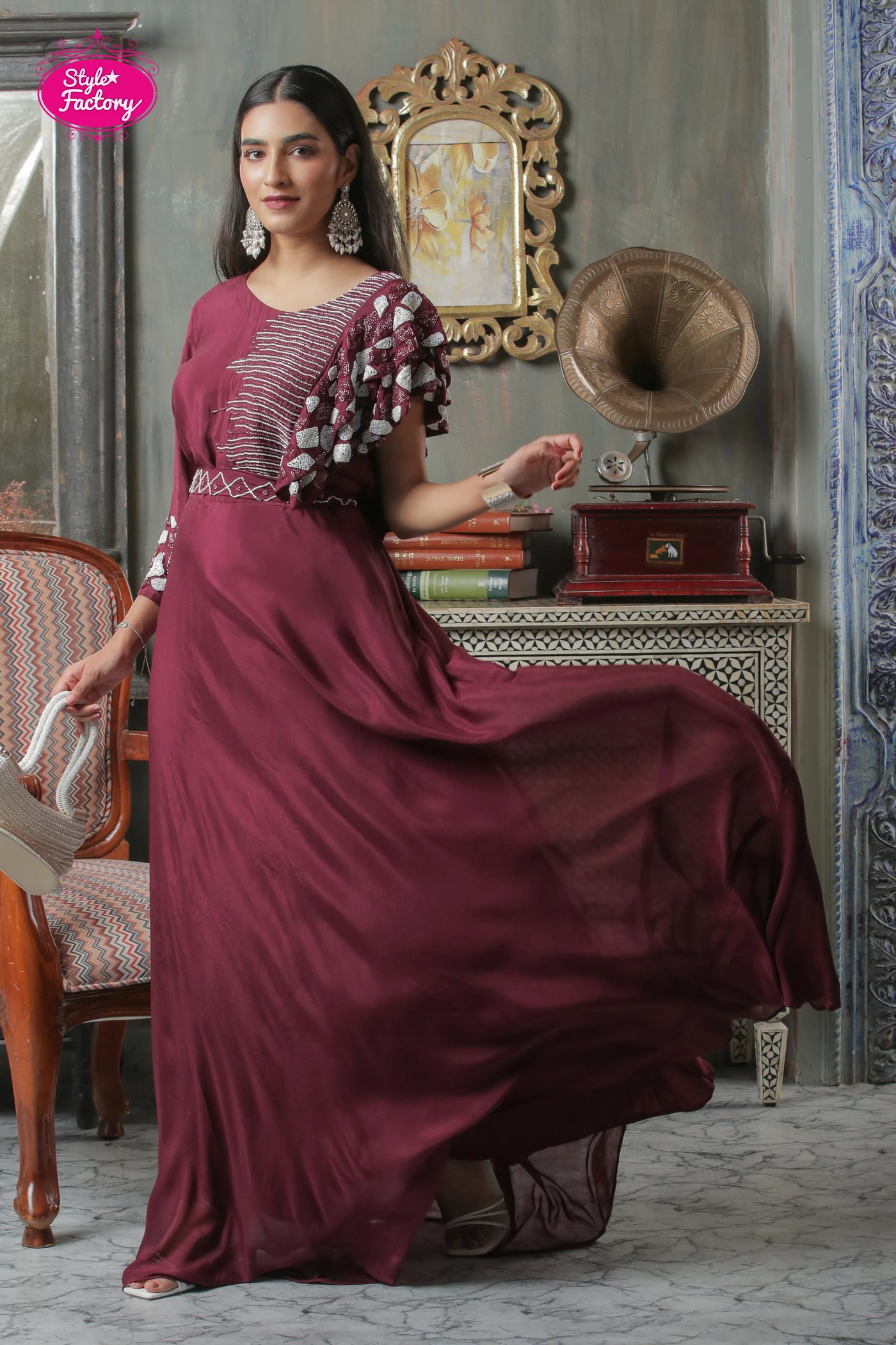 Turn heads in this elegant Wine Ruffle Sleeve Embroidered Gown, a perfect blend of modern grace and ethnic charm. Crafted from premium flowy fabric, this gown features intricate silver thread embroidery across the bodice and sleeves. The asymmetric ruffle detailing on one shoulder adds a touch of sophistication, while the flattering waist design enhances your silhouette. Ideal for festive celebrations, weddings, and evening occasions — this gown brings effortless glamour to every step.